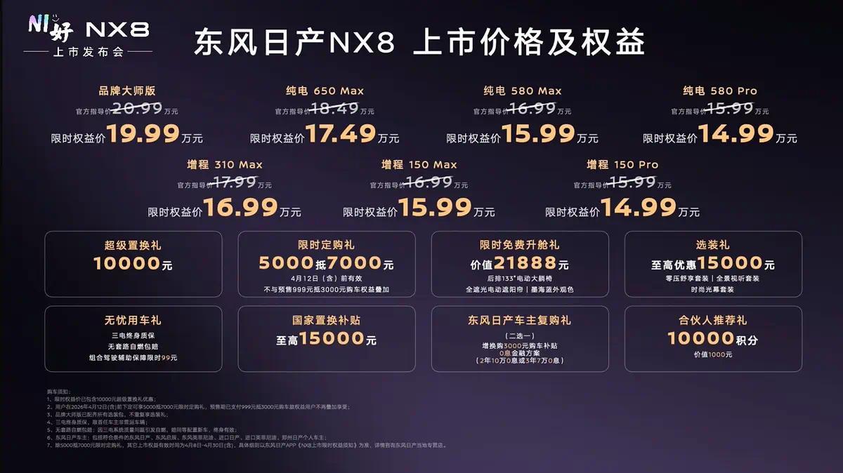 IT之家4月8日消息最新配资官网,东风日产全新中大型智能电动SUV——NX8正式上市,限时权益价14.99-19.99万元。据了解,该车型聚焦于高品质家庭用户市场,通过其卓越的空间表现、前沿的智能化配置以及对家庭出行场景的深度洞察,为20万级家用SUV细分市场树立全新的价值标杆。同时,该车型所倡导的“标配即满配”产品哲学,彰显了东风日产对于产品力与用户价值的深刻理解。