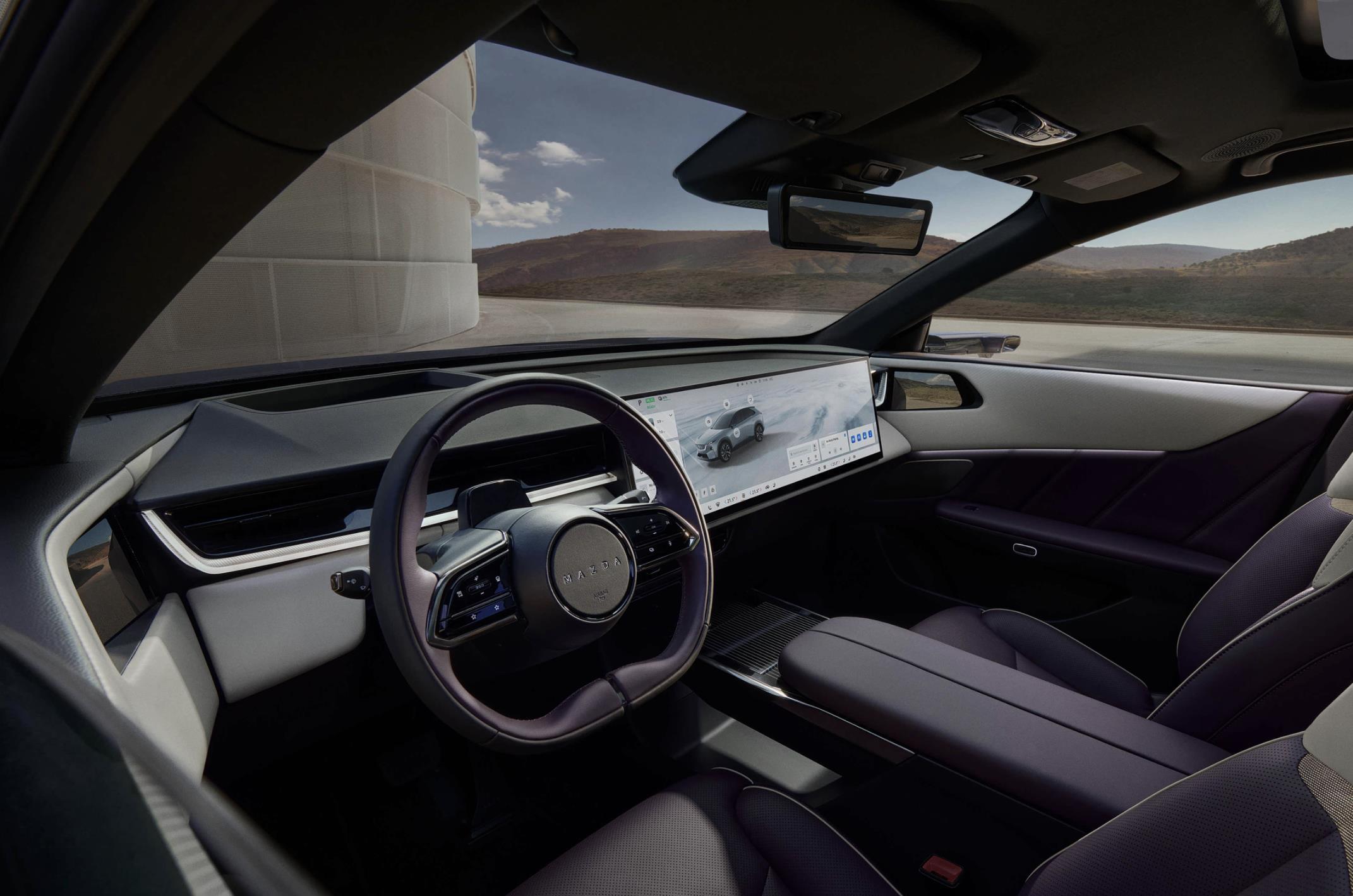 马自达CX-6e与国产马自达EZ-60保持一致,内饰采用了居家氛围浓郁的黑白撞色搭配。它运用了大面积Alcantara面料和皮革面料的铺陈,大量镀铬元素和运动座椅的加持,再配上带有换挡拨片的三幅式多功能方向盘,运动氛围更加爆棚。最大的亮点在于它配备的26.45英寸5K悬浮一体式屏幕,拥有50英寸高清AR-HUD,配置也相当丰富,像是一键启动、胎压监测、牵引力控制、车道偏离、前后探测雷达、刹车辅助灯系统,还是非常厚道。环抱式的座舱配备了平底式多功能方向盘和怀挡式换挡机构,也带拉了不一样的操控体验。配备的沙发座椅支持前排座椅加热/按摩、头枕扬声器及256色氛围灯,搭载由5个摄像头、5个雷达及12个超声波传感器组成的高级传感器网络。