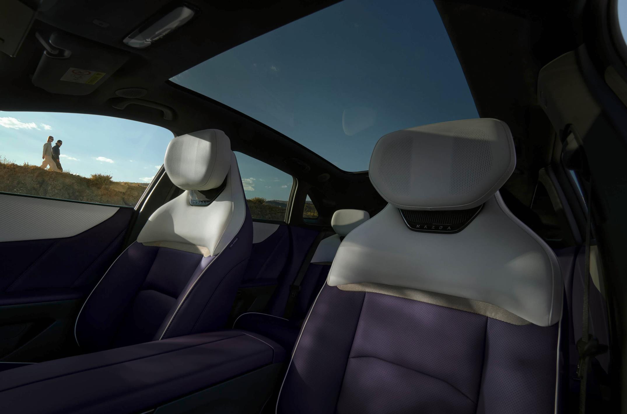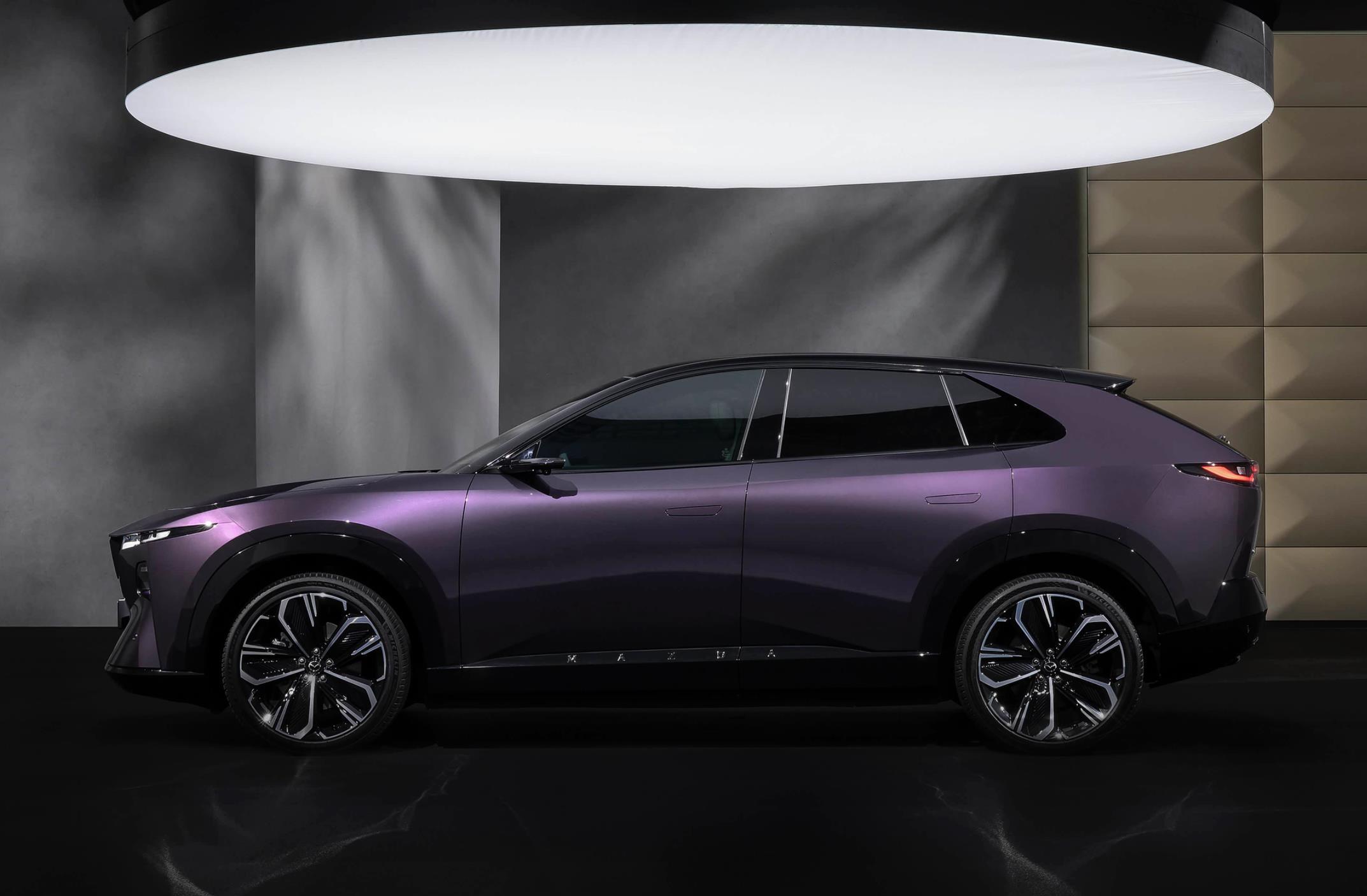马自达CX-6e的车身采用了轿跑式轮廓,倾斜的黑色A柱与弧线形的车顶一气呵成,并与黑色加宽的B柱/C柱、黑色的车窗装饰边框巧妙地融为一体,形成了悬浮式车顶的立体效果。车身加入了灵动、妖娆的腰线设计,四个隐藏式的门把手和四个无边框车门的加入,黑色宽大的侧裙与前后拱形的轮眉连接在一起,还配备了21英寸的多辐式锻造轮圈,匹配了255/40 R21米其林竞驰4 SUV轮胎,内置红色制动卡钳罩,还配备了硕大的黑色倒车镜外壳。整车更加激进、运动。车身尺寸方面,马自达CX-6e长宽高分别为4850/1935/1620毫米,轴距2902毫米,车内采用了标准的5座布局。